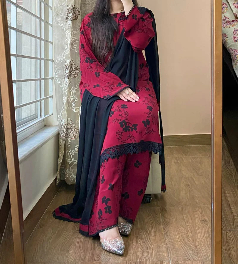 Elevate your traditional wardrobe with this elegant 3-piece ensemble, crafted from premium fabrics and detailed with delicate embellishments.