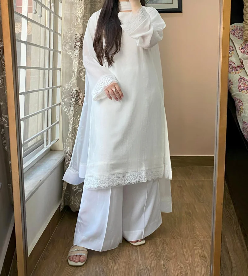 - Dupatta: Lightweight chiffon dupatta with lace on two corners, offering a soft, flowy drape.