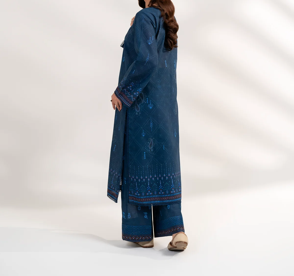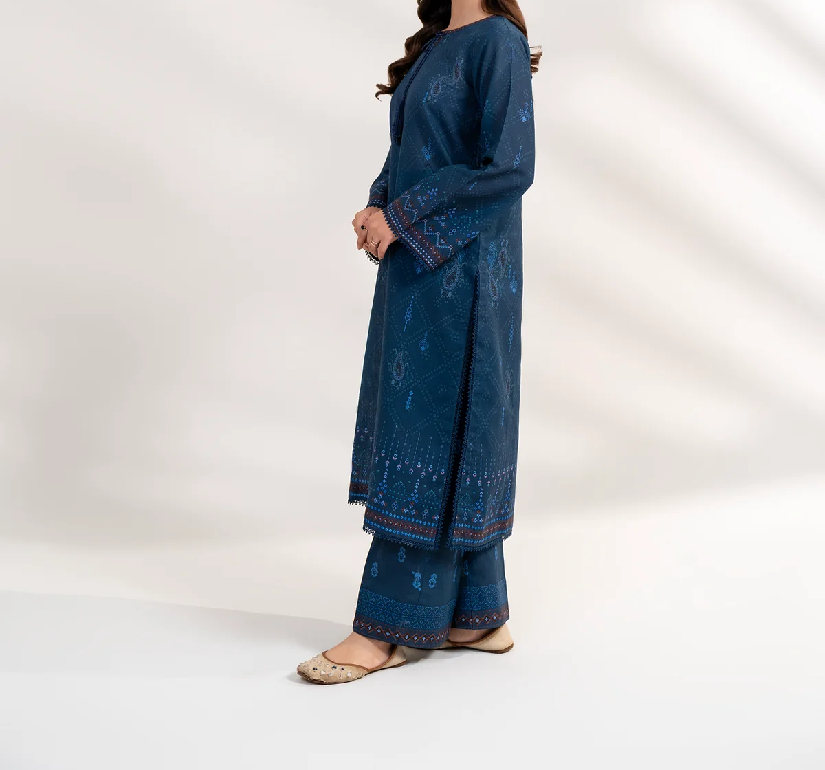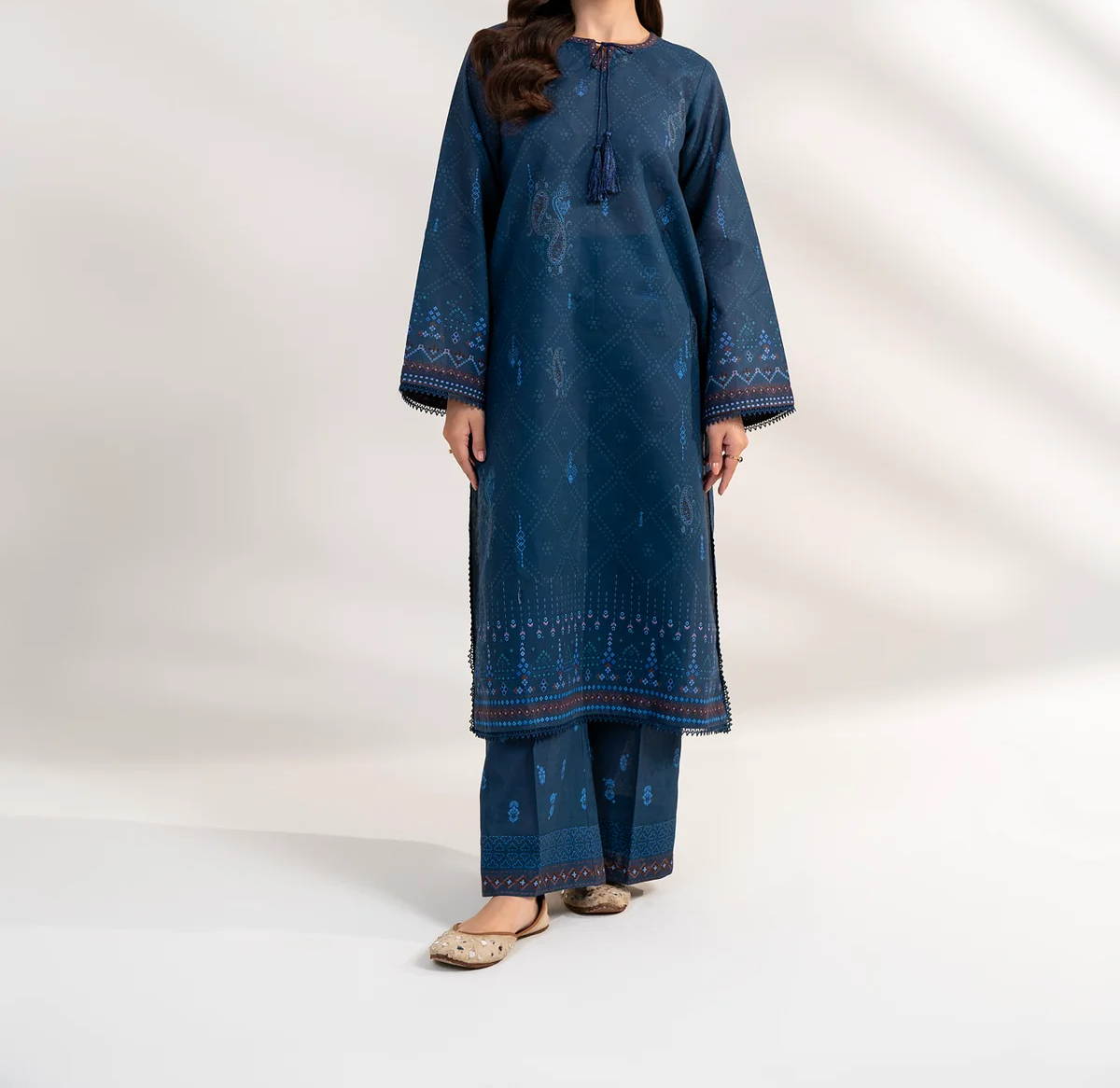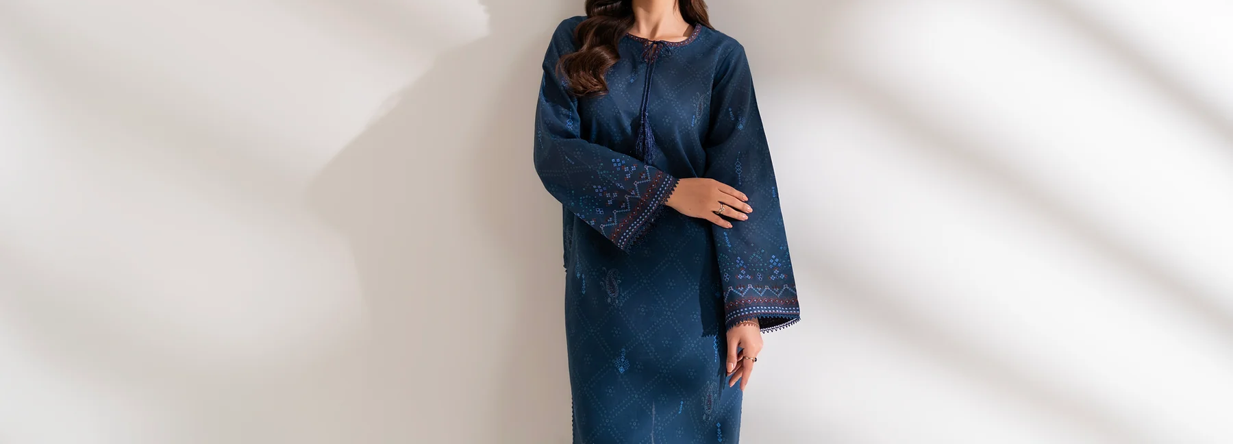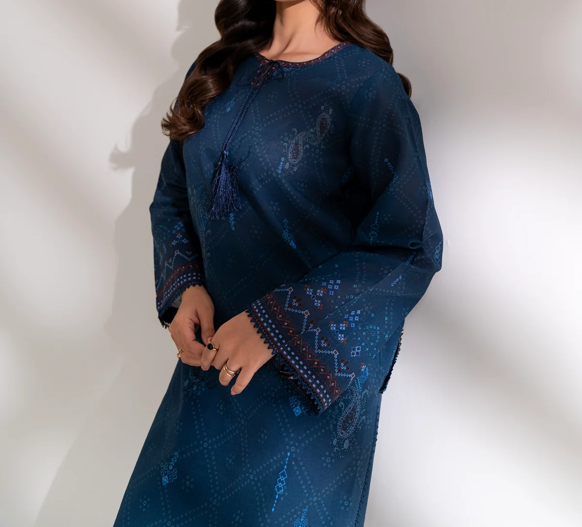 Stunning like the night sky this blue has a beautiful chunri print with traditional printed motifs along the long shirt and is paired with a slight flared trouser.