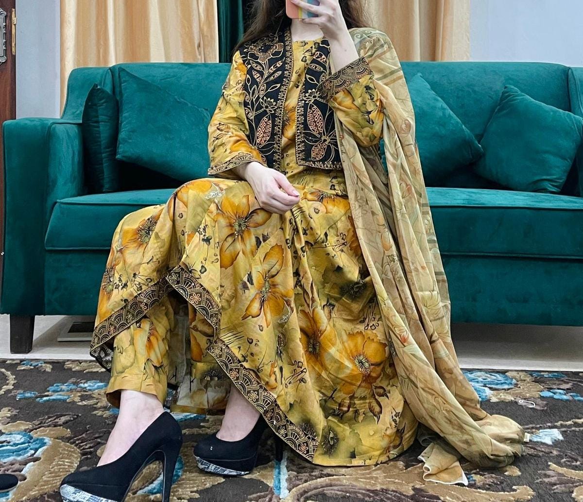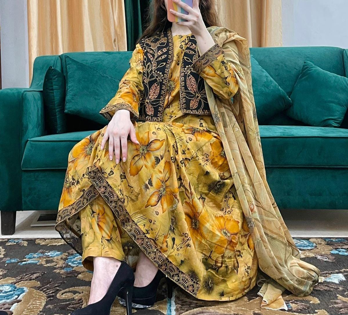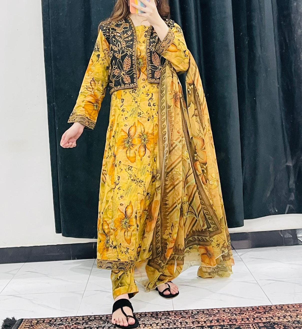 3pcs beautiful Wasket frock embroidered work with print jurjit chiffon dupatta & trousers
