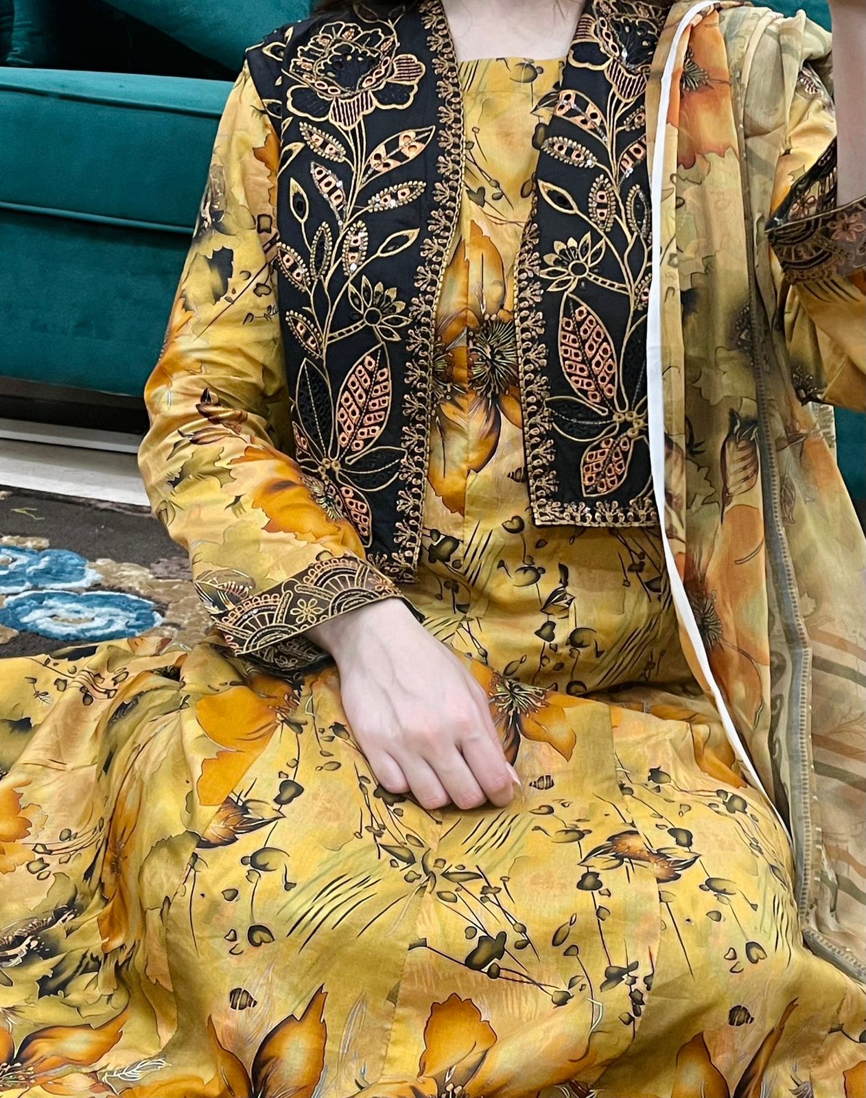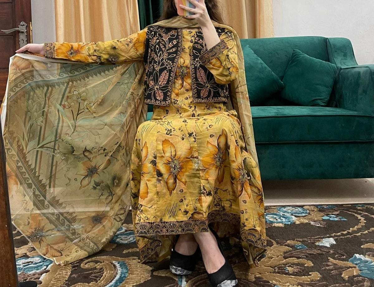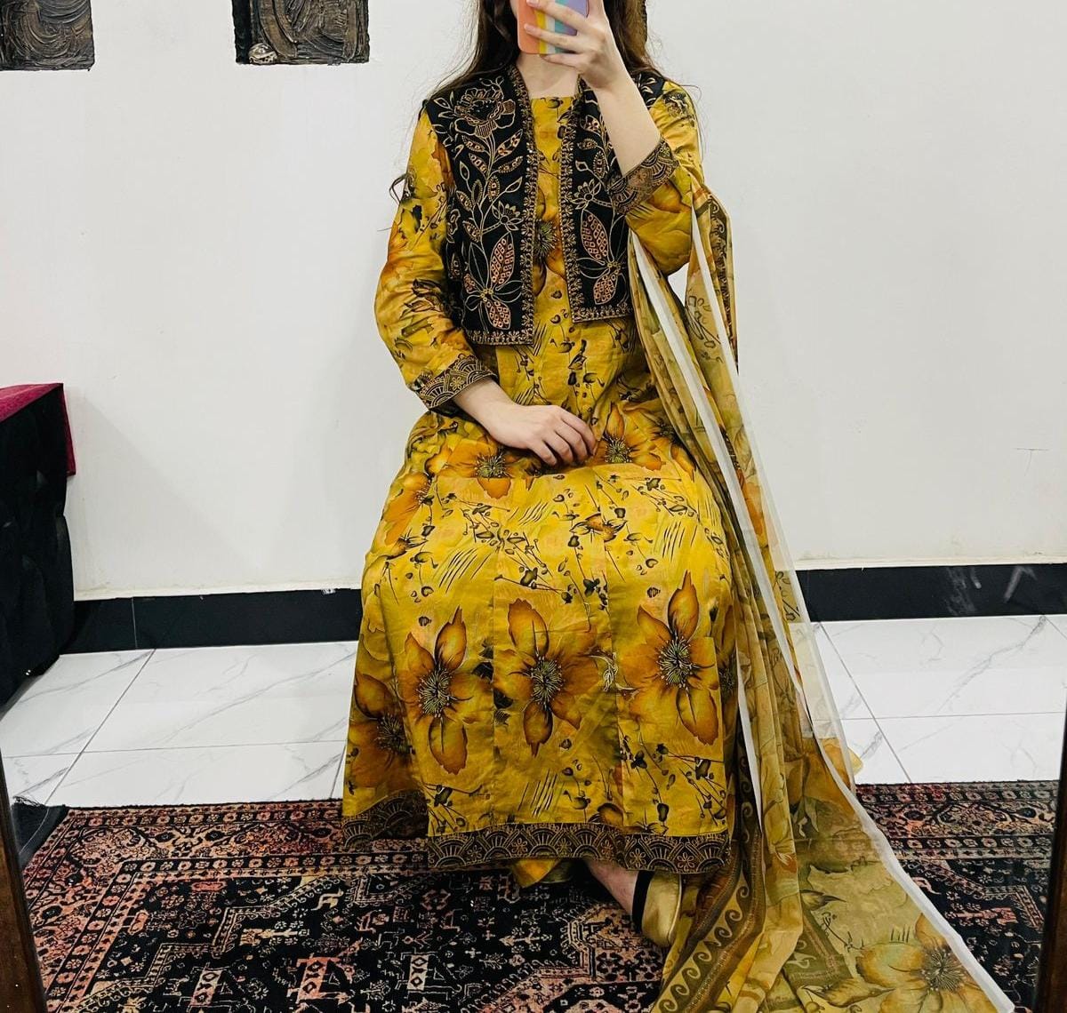 3pcs beautiful Wasket frock embroidered work with print jurjit chiffon dupatta & trousers