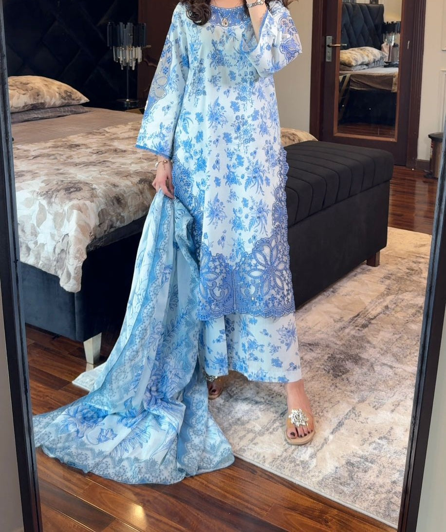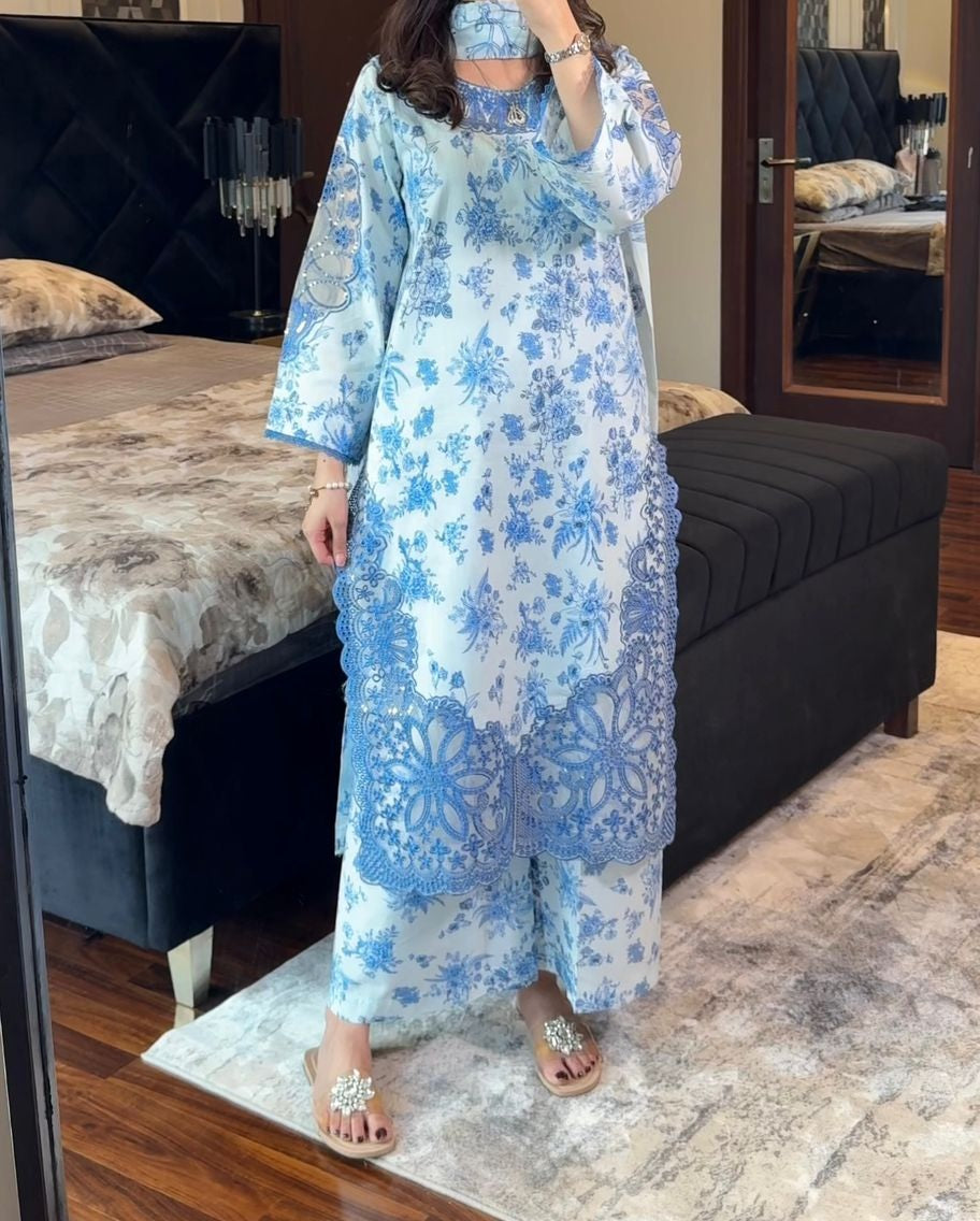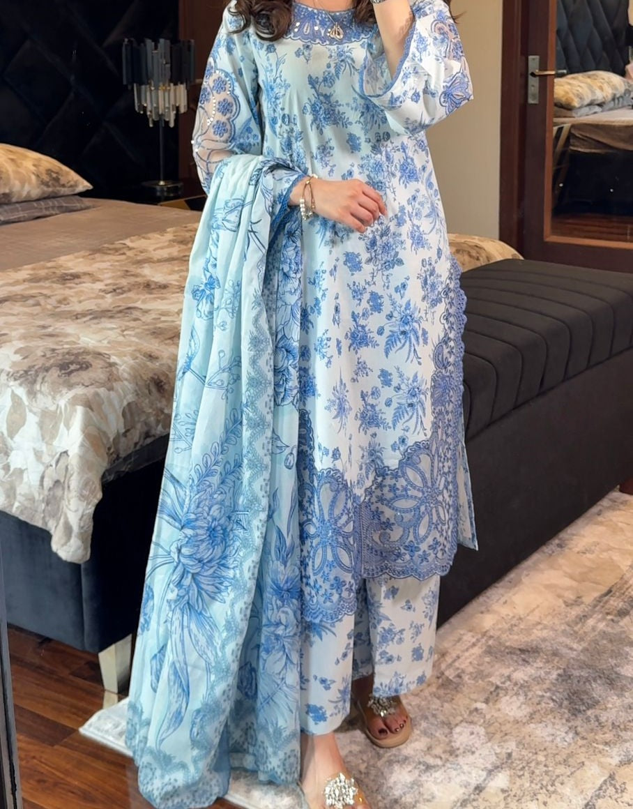 3pcs suit beautiful chicken Kari embroidered work with print jurjit chiffon dupatta