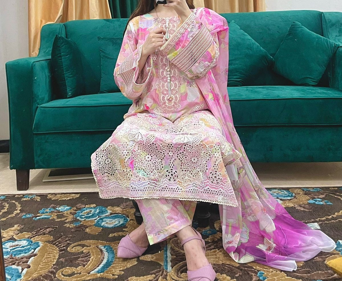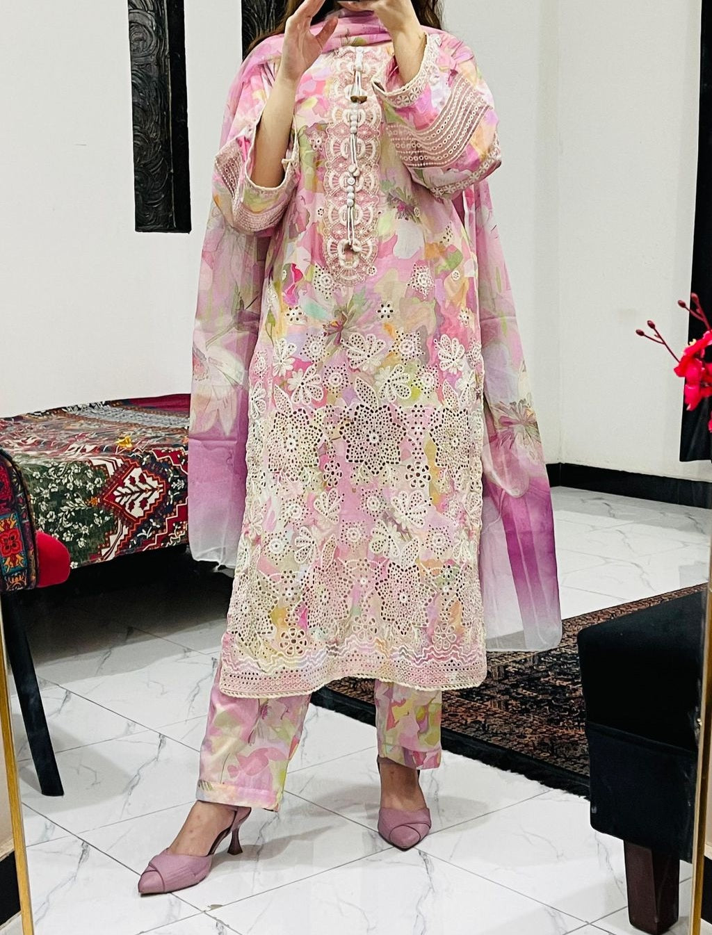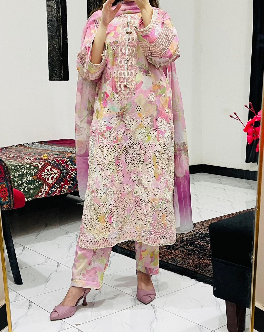3pcs suit beautiful chicken Kari embroidered work with print jurjit chiffon dupatta