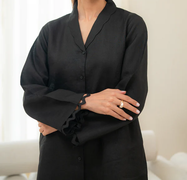 An elegant black cord set featuring a shawl collar and button-up design, styled with loose sleeves and straight-cut pants. The look is enhanced with minimal yet chic eyelet embroidery at the shirt front, while scalloped-style lace accents along the sleeve and pant borders add a refined, contemporary finish.