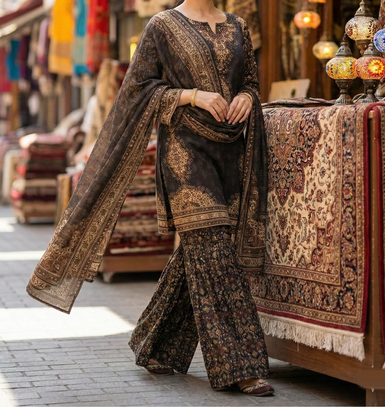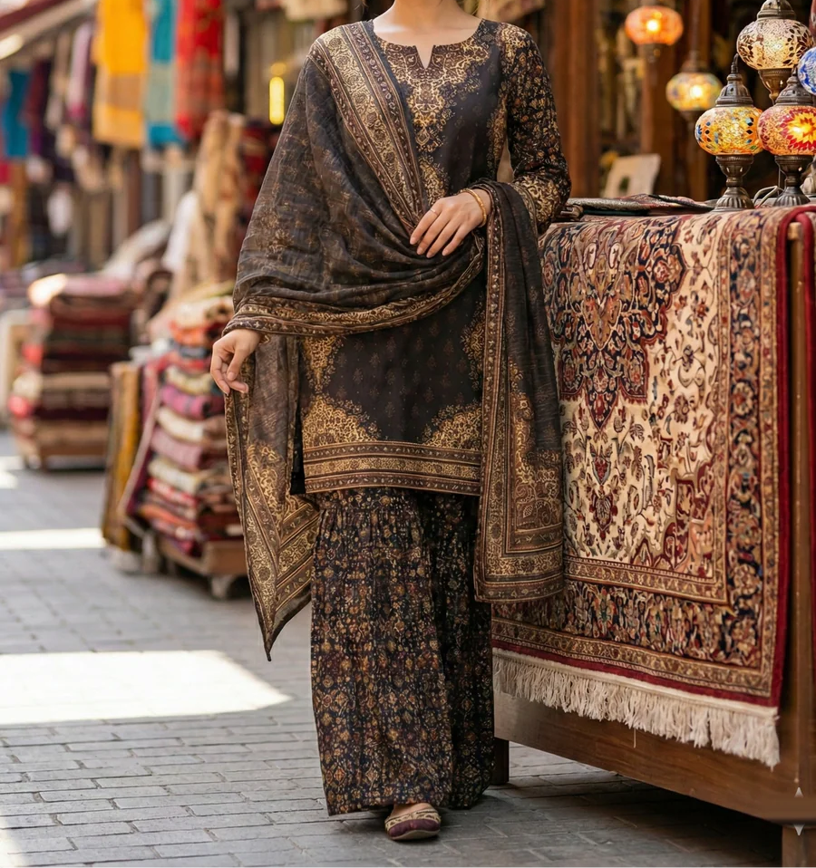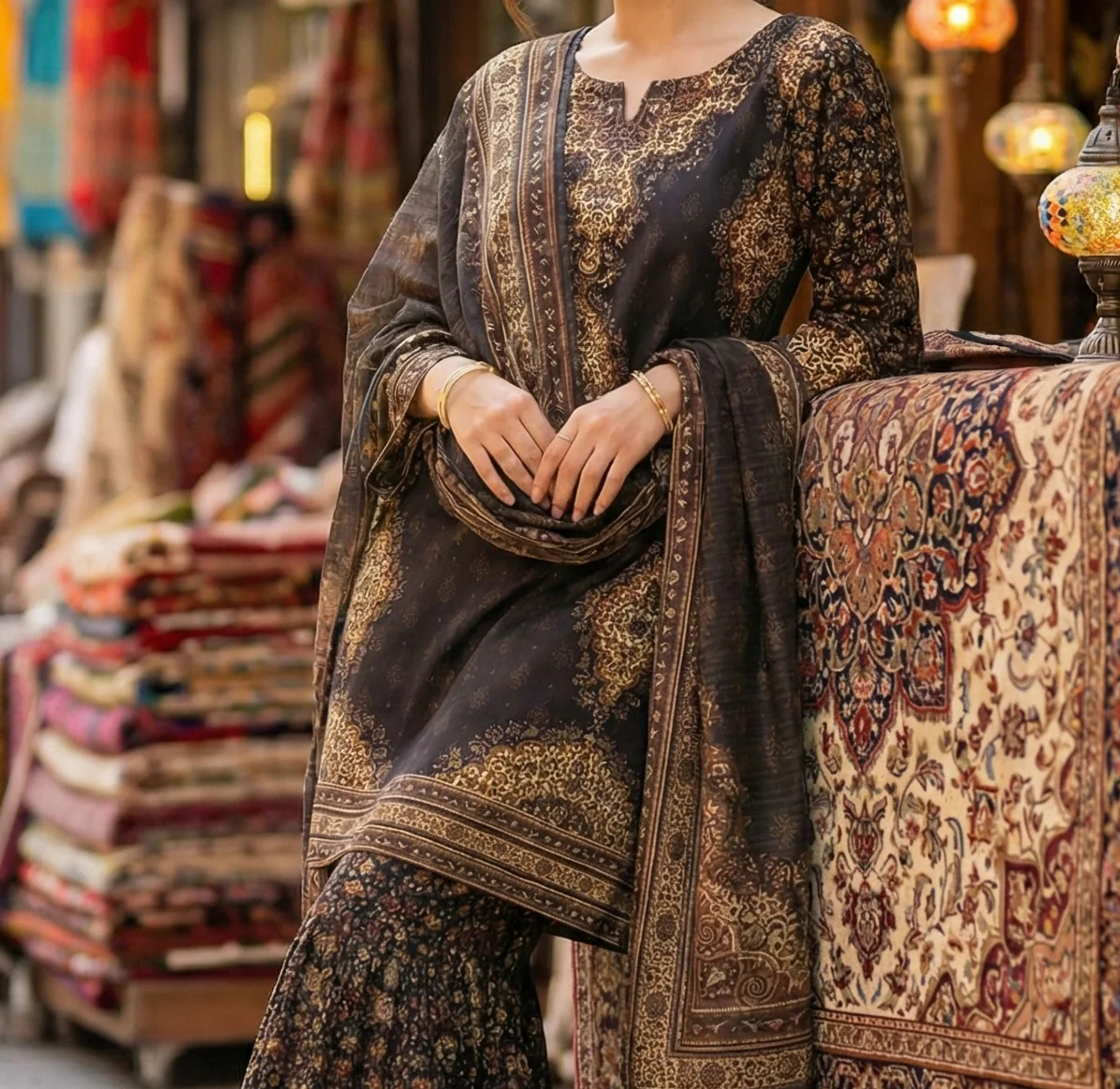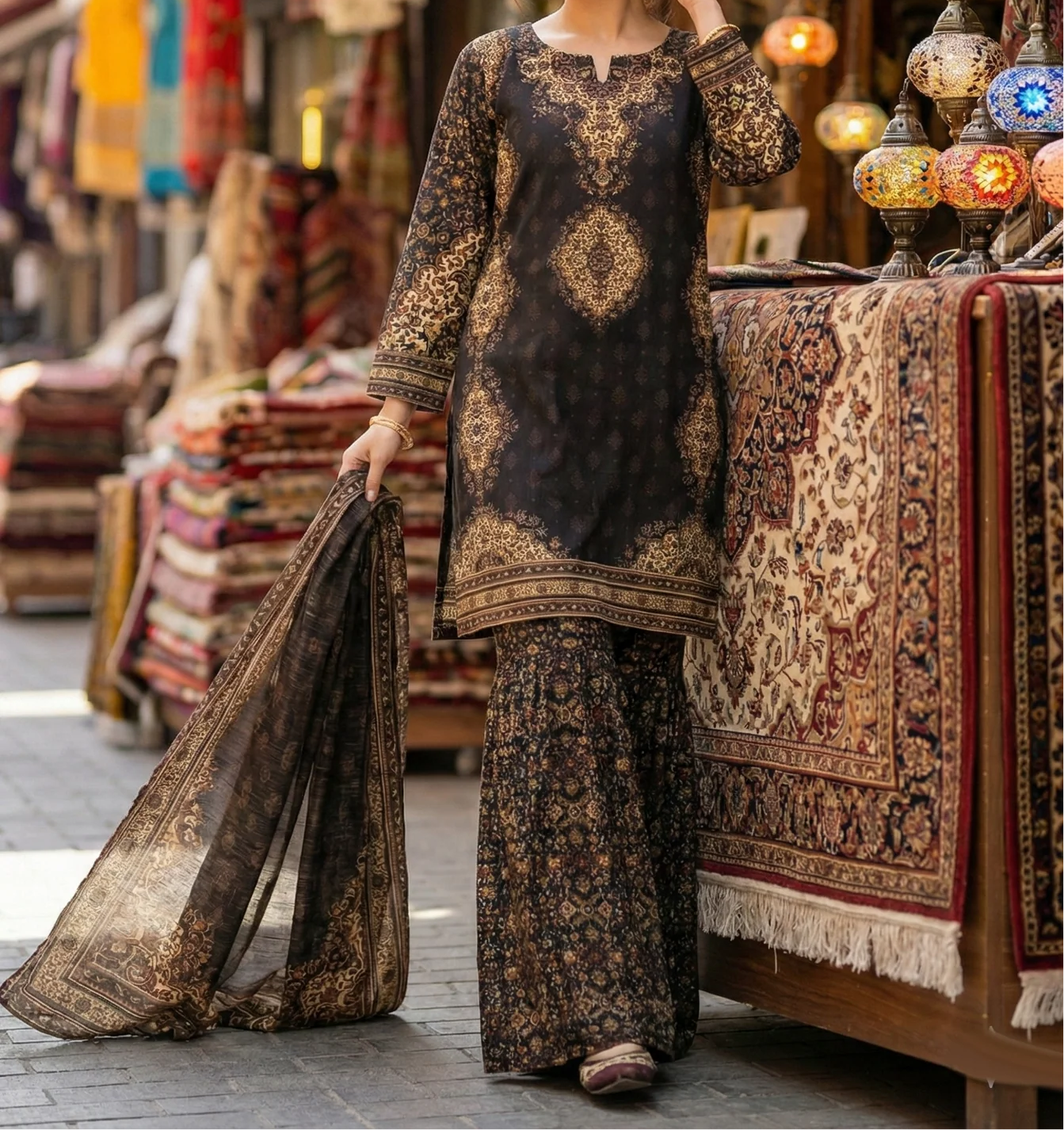 Stitched: PRINTED SILK LAWN SHIRT PRINTED SILK LAWN GHARARA PRINTED MONAR DUPATTA All colours may vary due to shoot &...