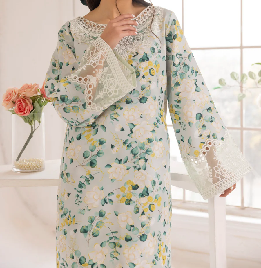 PRINTED SILK VISCOSE SHIRT ADORNED WITH DELICATE & EYE CATCHING SEQUIN EMBROIDERY DETAIL ON NECK-LINE, SLEEVES BORDER & FRONT BORDER