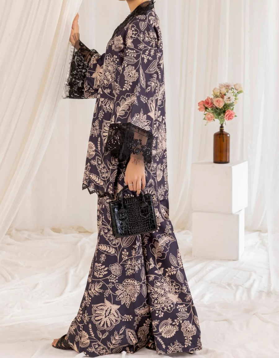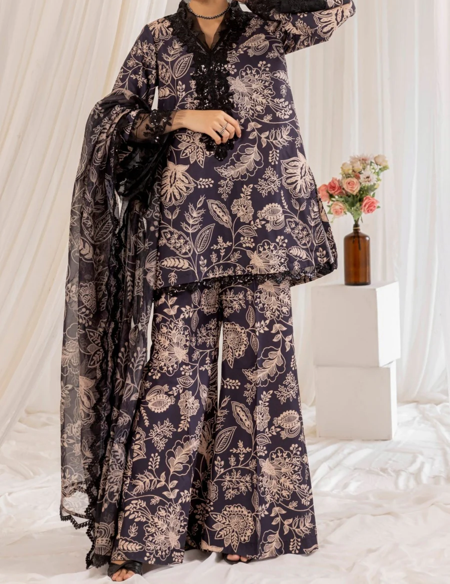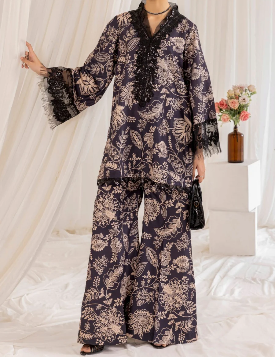 PRINTED SILK VISCOSE SHIRT ADORNED WITH DELICATE & EYE CATCHING SEQUIN EMBROIDERY DETAIL ON NECK-LINE, SLEEVES BORDER & FRONT BORDER