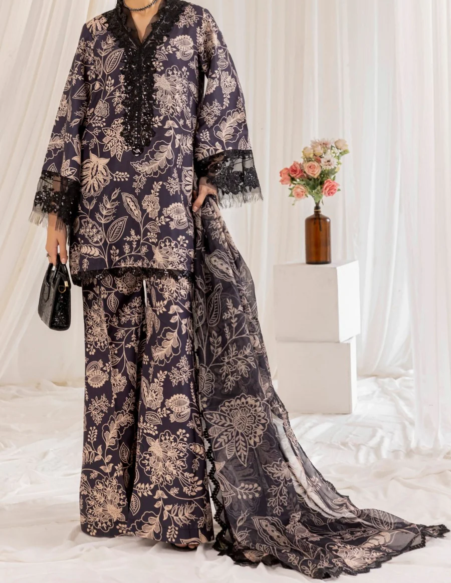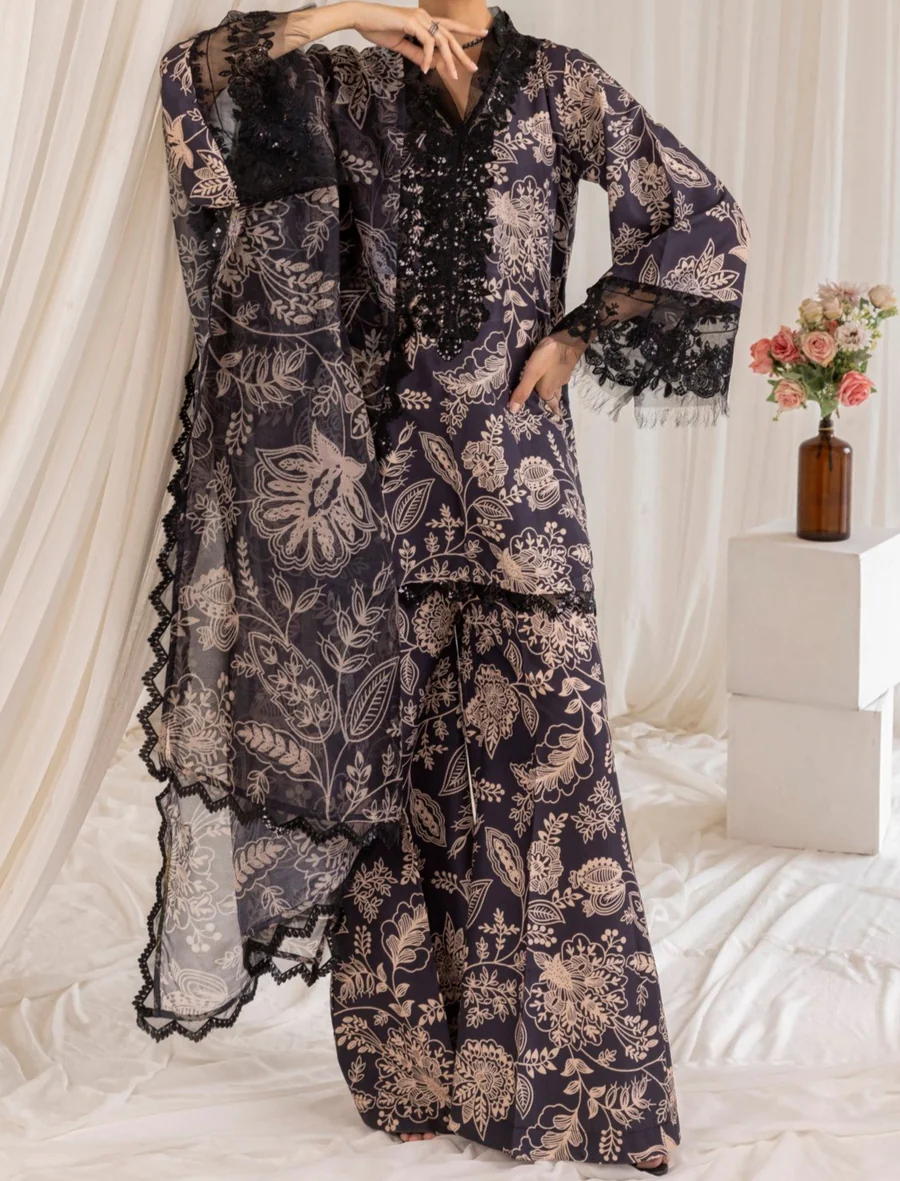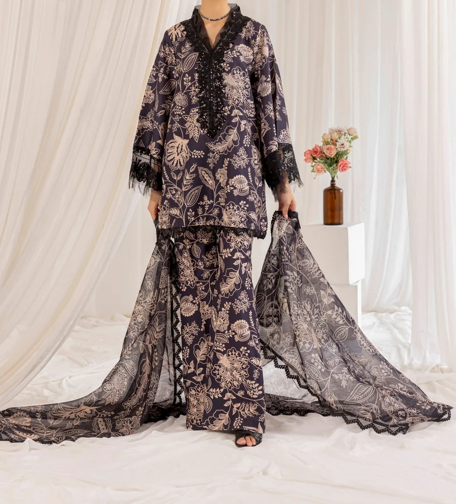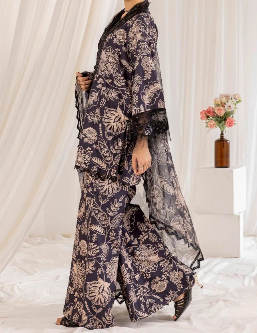 PRINTED SILK VISCOSE SHIRT ADORNED WITH DELICATE & EYE CATCHING SEQUIN EMBROIDERY DETAIL ON NECK-LINE, SLEEVES BORDER & FRONT BORDER
