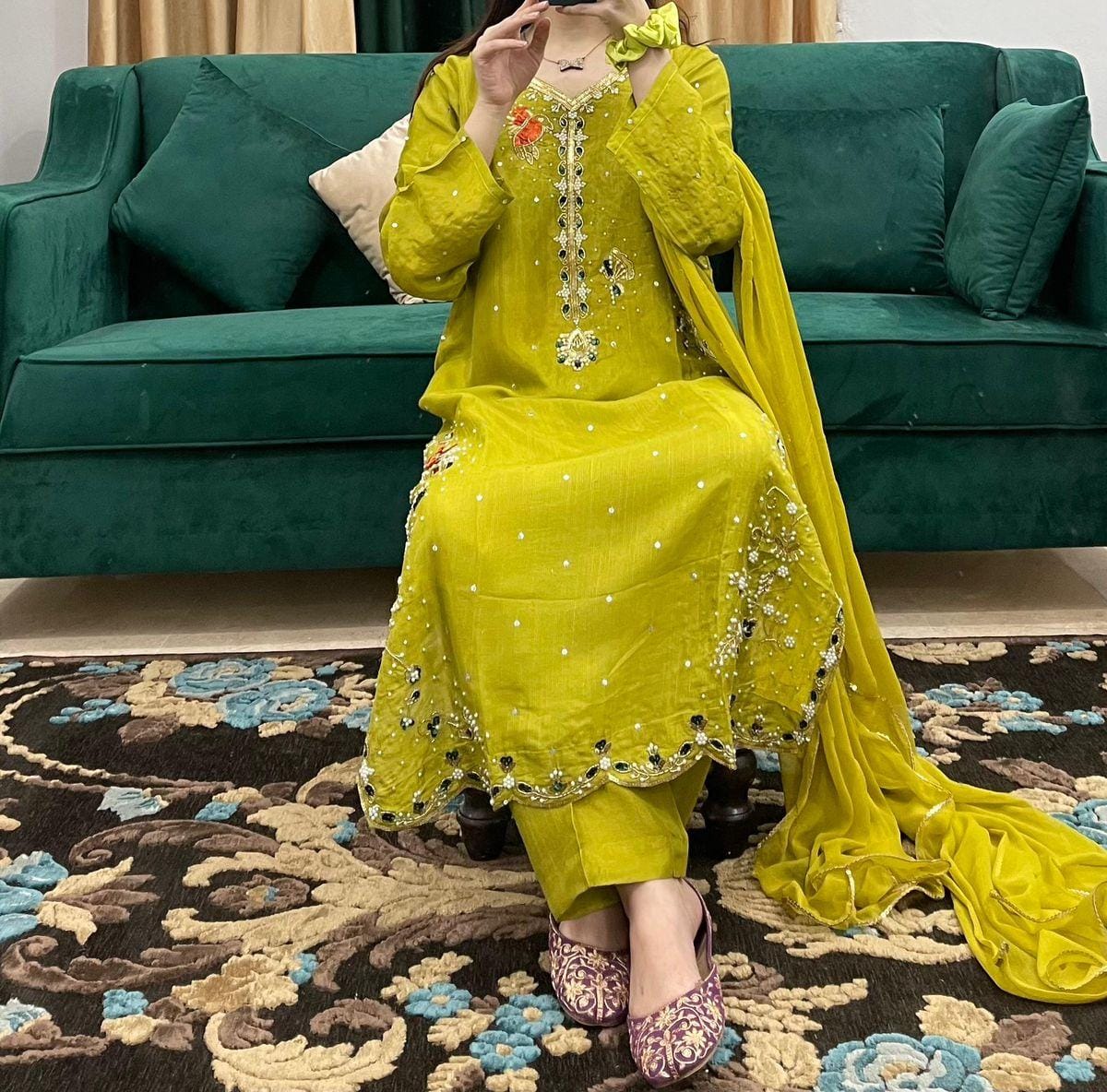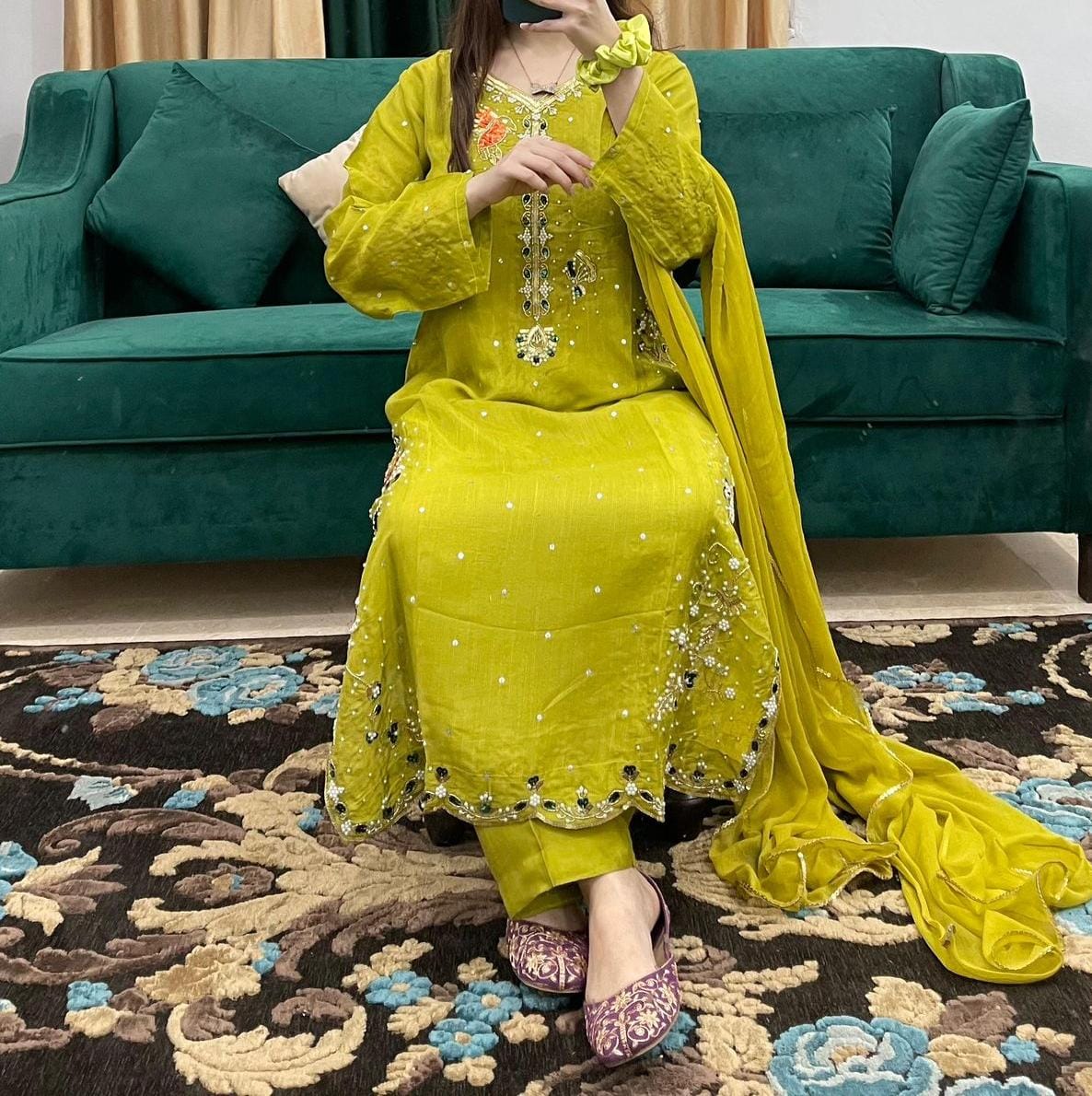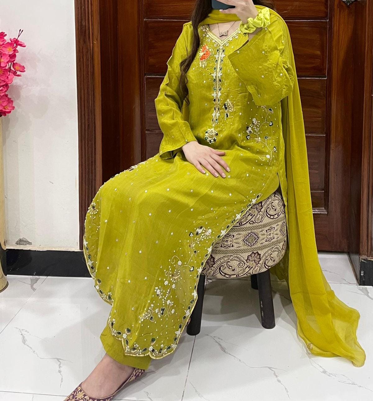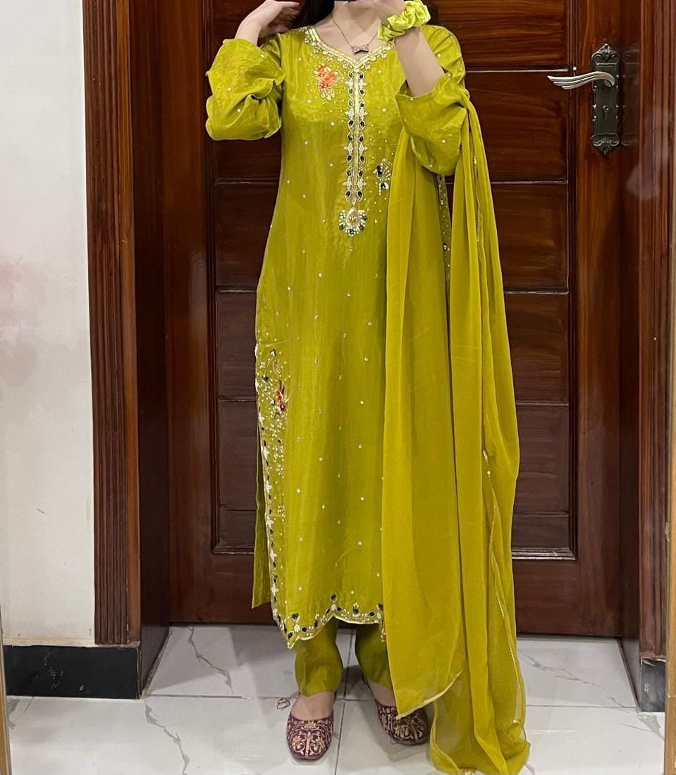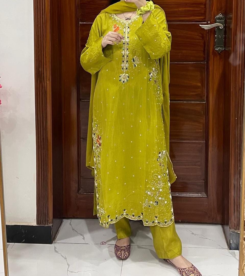 3Pc Handmade Sequence and Moti Work With Chiffon Dupatta and Silk Trouser