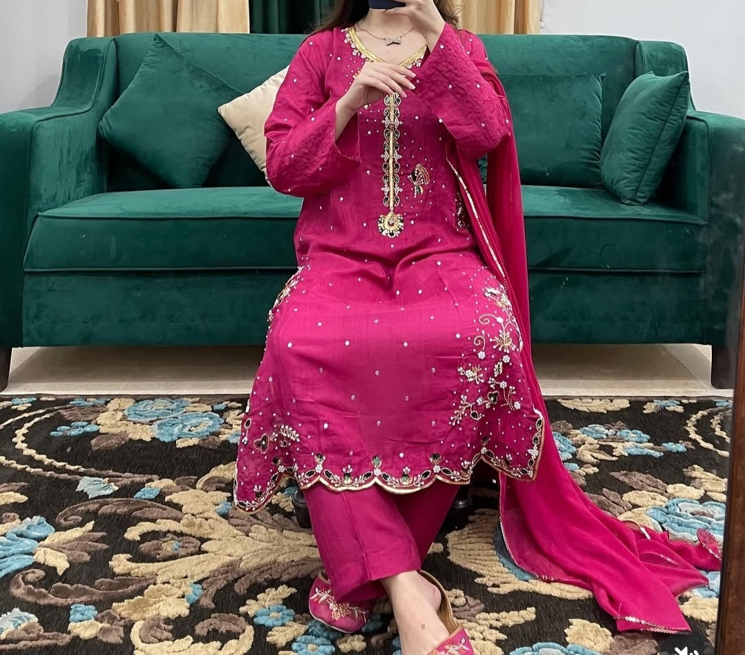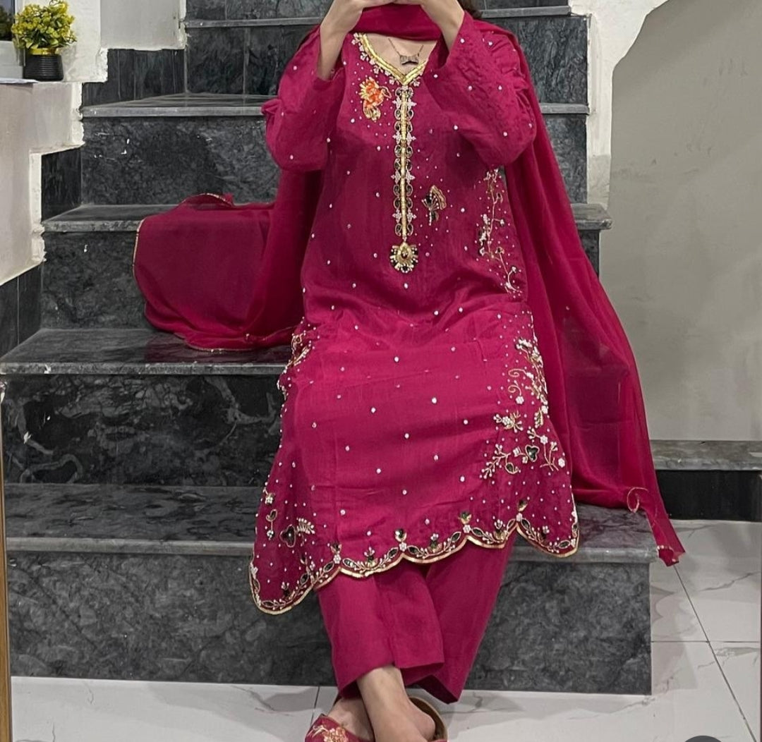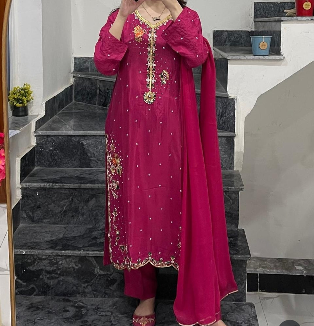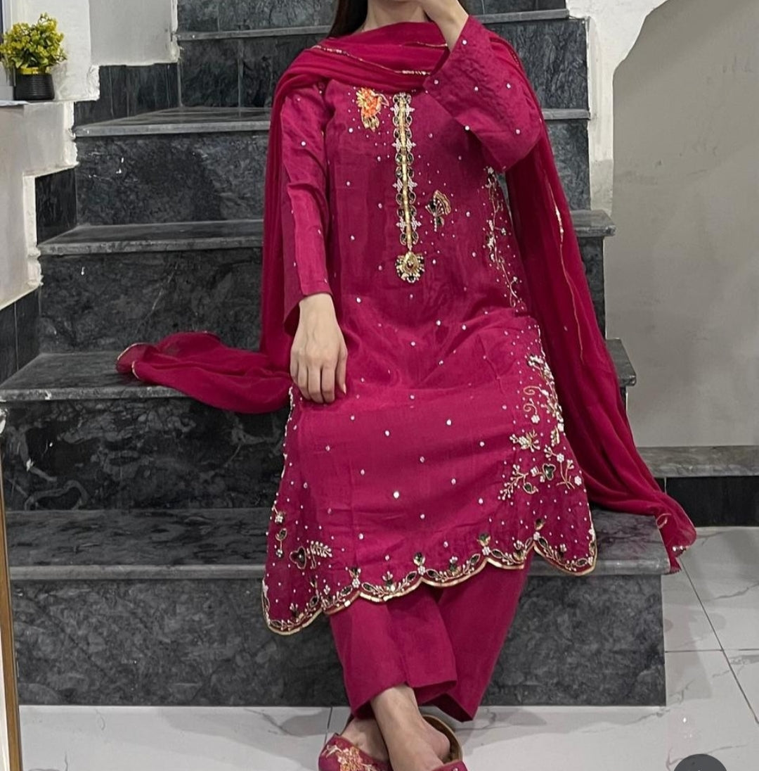 3Pc Handmade Sequence and Moti Work With Chiffon Dupatta and Silk Trouser